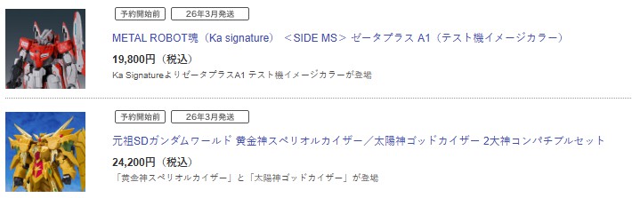 【新作予約】「METAL ROBOT魂(Ka signature)ゼータプラスA1(テスト機イメージカラー)」と「黄金神スペリオルカイザー/太陽神ゴッドカイザー 2大神コンパチブルセット」がプレバン限定で予約開始!