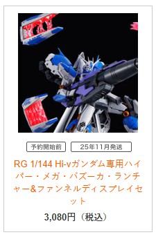 【ガンプラ新作】「RG Hi-νガンダム専用ハイパー・メガ・バズーカ・ランチャー&ファンネルディスプレイセット」がプレバン限定で12時より予約開始! 2025.10.21 「RG Hi-νガンダム専用ハイパー・メガ・バズーカ・ランチャー&ファンネルディスプレイセット」がプレバン限定で12時より予約開始! プレバン ガンプラ新作 RG 1/144 Hi-νガンダム専用ハイパー・メガ・バズーカ・ランチャー&ファンネルディスプレイセット【11月発送】 関連リンク ●プレミアムバンダイ ●バンダイホビーサイト