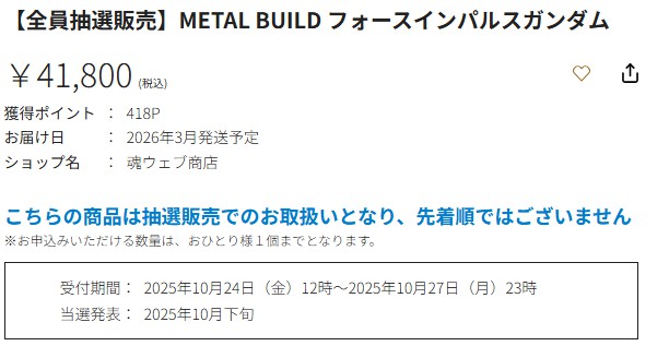 【新作予約】「METAL BUILD フォースインパルスガンダム」がプレバン限定で抽選販売の受付を開始! 2025.10.24 「METAL BUILD フォースインパルスガンダム」がプレバン限定で抽選販売の受付を開始! プレバン 新作フィギュア METAL BUILD フォースインパルスガンダム【全員抽選販売】【2026年3月発送】 関連リンク ●プレミアムバンダイ ●魂ウェブ 公式サイト