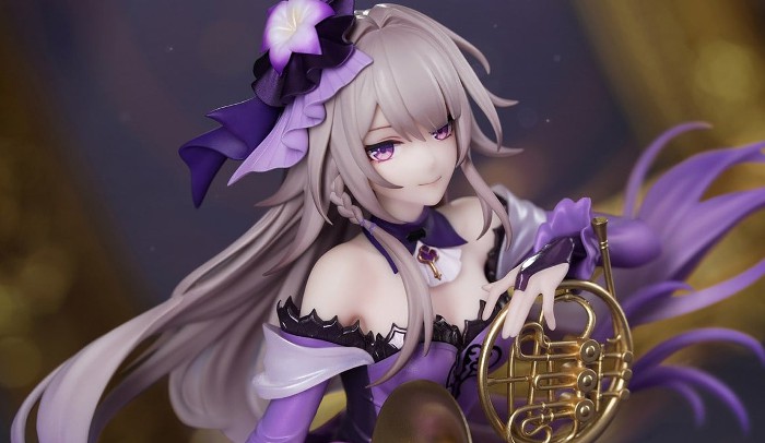 フレンチホルンをそっと抱きかかえ、気高く優雅に佇むヘルタの姿を立体化しました。紫のドレスは多層グラデーションとパール塗装で仕上げられ、神秘的な光を放ちながら気品あふれる雰囲気を演出。裾にはきらめくラメが散りばめられ、軽やかに舞うたびに星屑のように輝きます。