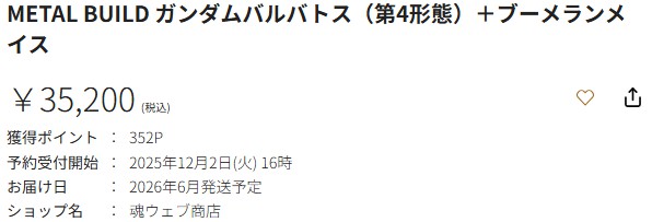 【新作予約】「METAL BUILD ガンダムバルバトス(第4形態)+ブーメランメイス」がプレバン限定で予約開始! 2025.12.02 「METAL BUILD ガンダムバルバトス(第4形態)+ブーメランメイス」がプレバン限定で予約開始! プレバン 新作フィギュア METAL BUILD ガンダムバルバトス(第4形態)+ブーメランメイス【2026年6月発送】 関連リンク ●プレミアムバンダイ ●魂ウェブ 公式サイト