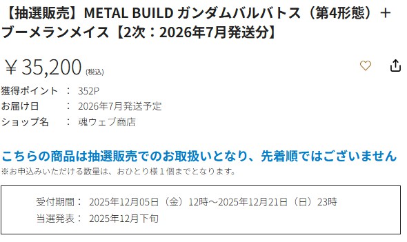 【抽選】「METAL BUILD ガンダムバルバトス(第4形態)+ブーメランメイス【2次】」がプレバン限定で抽選予約の受付を開始! 2025.12.05 「METAL BUILD ガンダムバルバトス(第4形態)+ブーメランメイス【2次】」がプレバン限定で抽選予約の受付を開始! プレバン 新作フィギュア METAL BUILD ガンダムバルバトス(第4形態)+ブーメランメイス【抽選販売】【2次:2026年7月発送発送】 関連リンク ●プレミアムバンダイ ●魂ウェブ 公式サイト