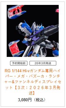 【ガンプラ再販】「RG Hi-νガンダム専用ハイパー・メガ・バズーカ・ランチャー&ファンネルディスプレイセット【3次】」がプレバン限定で予約開始! 2025.12.11 「RG Hi-νガンダム専用ハイパー・メガ・バズーカ・ランチャー&ファンネルディスプレイセット【3次】」がプレバン限定で予約開始! プレバン ガンプラ再販 RG 1/144 Hi-νガンダム専用ハイパー・メガ・バズーカ・ランチャー&ファンネルディスプレイセット【3次】【2026年3月発送】 関連リンク ●プレミアムバンダイ ●バンダイホビーサイト