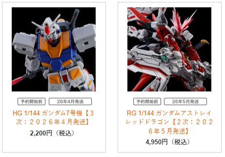 【ガンプラ再販】「HG ガンダム7号機【3次】」と「RG ガンダムアストレイ レッドドラゴン【2次】」がプレバン限定で予約開始! 2025.12.17 「HG ガンダム7号機【3次】」と「RG ガンダムアストレイ レッドドラゴン【2次】」がプレバン限定で予約開始! プレバン ガンプラ再販 HG 1/144 ガンダム7号機【3次:2026年4月発送】 RG 1/144 ガンダムアストレイ レッドドラゴン【2次:2026年5月発送】 関連リンク ●プレミアムバンダイ ●バンダイホビーサイト