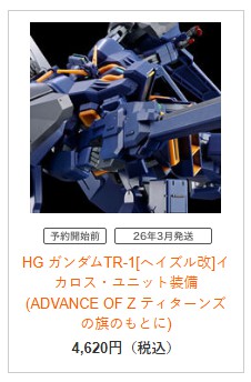 【ガンプラ新作】「HG ガンダムTR-1[ヘイズル改]イカロス・ユニット装備(ADVANCE OF Z ティターンズの旗のもとに)」がプレバン限定で予約開始! 2025.12.18 「HG ガンダムTR-1[ヘイズル改]イカロス・ユニット装備(ADVANCE OF Z ティターンズの旗のもとに)」がプレバン限定で予約開始! プレバン ガンプラ新作 HG ガンダムTR-1[ヘイズル改]イカロス・ユニット装備(ADVANCE OF Z ティターンズの旗のもとに)【2026年3月発送】 関連リンク ●プレミアムバンダイ ●バンダイホビーサイト