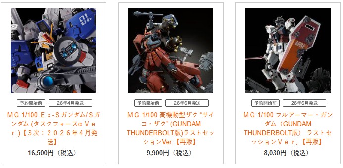 【ガンプラ再販】「MG Ex-Sガンダム/Sガンダム (タスクフォースα Ver.)【3次】」や「MG フルアーマー・ガンダム ラストセッションVer.【再販】」など3点がプレバン限定で予約開始! 2025.12.19 「MG Ex-Sガンダム/Sガンダム (タスクフォースα Ver.)【3次】」や「MG フルアーマー・ガンダム ラストセッションVer.【再販】」など3点がプレバン限定で予約開始! プレバン ガンプラ再販 MG 1/100 Ex-Sガンダム/Sガンダム (タスクフォースα Ver.)【3次:2026年4月発送】 MG 1/100 フルアーマー・ガンダム(GUNDAM THUNDERBOLT版)ラストセッションVer.【再販】【2026年6月発送】 MG 1/100 高機動型ザク “サイコ・ザク”(GUNDAM THUNDERBOLT版)ラストセッションVer.【再販】【2026年6月発送】 関連リンク ●プレミアムバンダイ ●バンダイホビーサイト