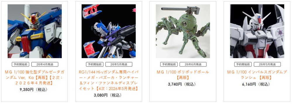 【ガンプラ再販】「MG 強化型ダブルゼータガンダム Ver.Ka」や「MG インパルスガンダムブランシュ」など4点がプレバン限定で予約開始! 2026.02.12 「MG 強化型ダブルゼータガンダム Ver.Ka」や「MG インパルスガンダムブランシュ」など4点がプレバン限定で予約開始! プレバン ガンプラ再販 MG 1/100 強化型ダブルゼータガンダム Ver.Ka【再販】【2次:4月発送】 RG 1/144 Hi-νガンダム専用ハイパー・メガ・バズーカ・ランチャー&フィン・ファンネルディスプレイセット【4次:5月発送】 MG 1/100 ポリポッドボール【再販】【6月発送】 MG 1/100 インパルスガンダムブランシュ【再販】【5月発送】 関連リンク ●プレミアムバンダイ ●バンダイホビーサイト