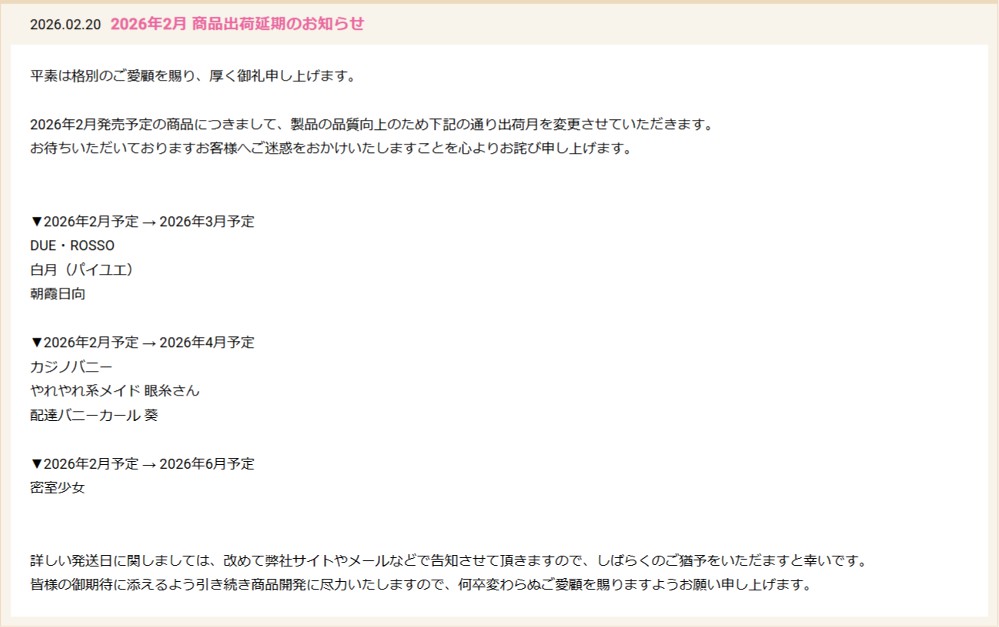「DUE・ROSSO」「白月(パイユエ)」「朝霞日向」が3月、「カジノバニー」「やれやれ系メイド 眼糸さん」「配達バニーカール 葵」が4月に延期。