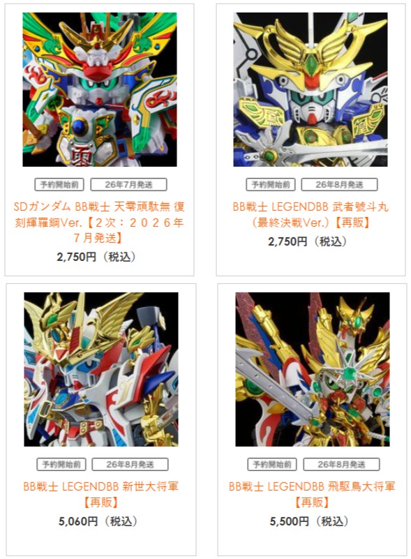 【ガンプラ再販】「SDガンダム BB戦士 天零頑駄無 復刻輝羅鋼Ver.」や「BB戦士 LEGENDBB 新世大将軍」など4点がプレバン限定で18時より予約開始! 2026.03.12 「SDガンダム BB戦士 天零頑駄無 復刻輝羅鋼Ver.」や「BB戦士 LEGENDBB 新世大将軍」など4点がプレバン限定で18時より予約開始! プレバン ガンプラ再販 SDガンダム BB戦士 天零頑駄無 復刻輝羅鋼Ver.【2次:7月発送】 BB戦士 LEGENDBB 武者號斗丸(最終決戦Ver.)【再販】【8月発送】 BB戦士 LEGENDBB 新世大将軍【再販】【8月発送】 BB戦士 LEGENDBB 飛駆鳥大将軍【再販】【8月発送】 関連リンク ●プレミアムバンダイ ●バンダイホビーサイト