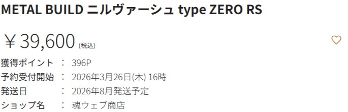 【新作予約】「METAL BUILD ニルヴァーシュ type ZERO RS」がプレバン限定で26日16時より予約開始! 2026.03.25 「METAL BUILD ニルヴァーシュ type ZERO RS」がプレバン限定で26日16時より予約開始! プレバン 新作フィギュア METAL BUILD ニルヴァーシュ type ZERO RS【8月発送】 関連リンク ●プレミアムバンダイ ●魂ウェブ 公式サイト