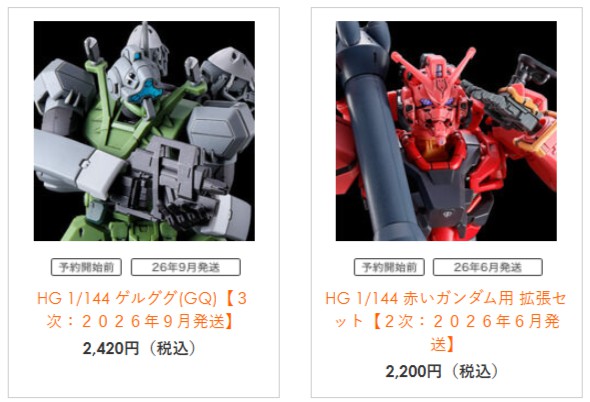 【ガンプラ再販】「HG ゲルググ(GQ)【3次】」と「HG 赤いガンダム用 拡張セット【2次】」がプレバン限定で予約開始! 2026.03.27 「HG ゲルググ(GQ)【3次】」と「HG 赤いガンダム用 拡張セット【2次】」がプレバン限定で予約開始! プレバン ガンプラ再販 HG 1/144 ゲルググ(GQ)【3次:9月発送】 HG 1/144 赤いガンダム用 拡張セット【2次:6月発送】 関連リンク ●プレミアムバンダイ ●バンダイホビーサイト