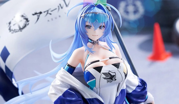 鮮やかなブルーを基調としたコスチュームは、光沢感のあるメタリック塗装で質感を再現。大胆に羽織ったジャケットやボディラインに沿った衣装の造形が、ニュージャージーの魅力的なプロポーションを引き立てます。さらに、ボリュームたっぷりのロングヘアと、大きくはためくレースフラッグで躍動感あふれる仕上がりに。