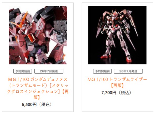 【ガンプラ再販】「MG ガンダムデュナメス(トランザムモード)[メタリックグロスインジェクション]」と「MG トランザムライザー」がプレバン限定で予約開始! 2026.03.30 「MG ガンダムデュナメス(トランザムモード)[メタリックグロスインジェクション]」と「MG トランザムライザー」がプレバン限定で予約開始! プレバン ガンプラ再販 MG 1/100 ガンダムデュナメス(トランザムモード)[メタリックグロスインジェクション]【再販】【7月発送】 MG 1/100 トランザムライザー【再販】【7月発送】 関連リンク ●プレミアムバンダイ ●バンダイホビーサイト