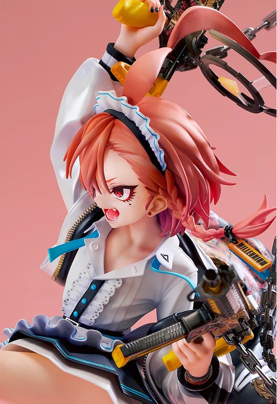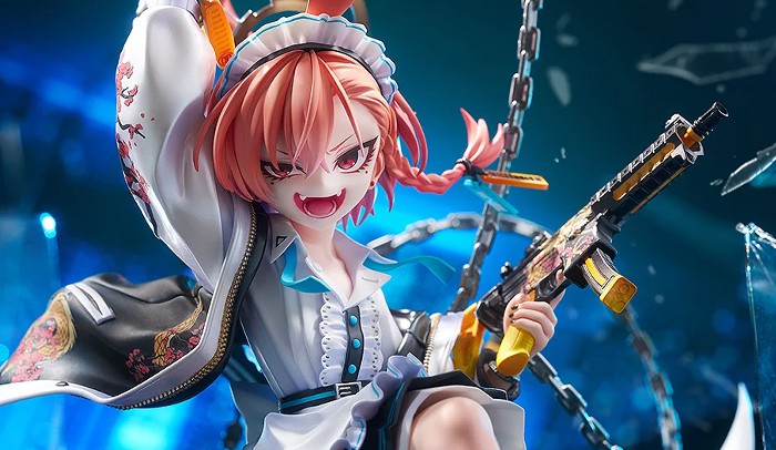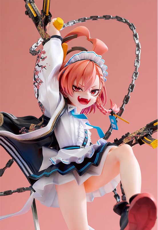 メイド服の上に羽織ったスカジャンは、パール塗装による独特の質感表現に加え、背面や袖に施された刺繍まで丁寧に再現。さらに、チェーンで繋がれた二挺一対のサブマシンガン「ツイン・ドラゴン」も、リアリティを追求した造形で仕上げました。