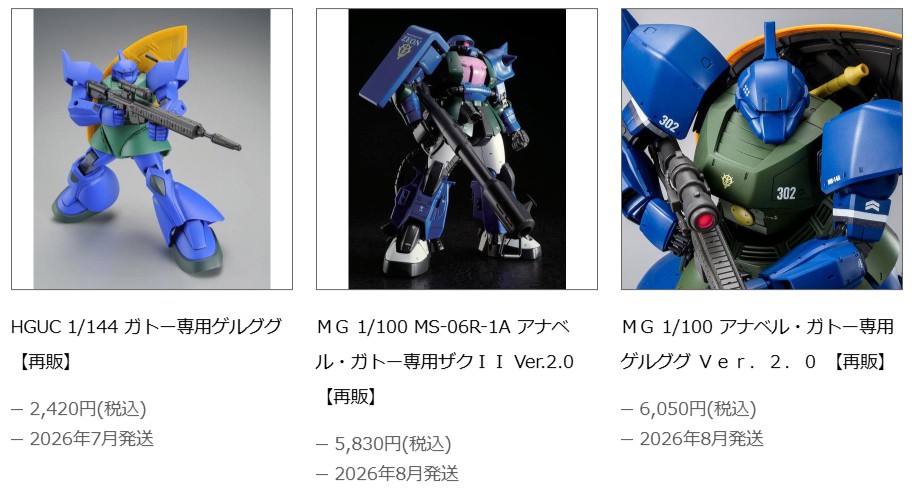 【ガンプラ再販】「MG アナベル・ガトー専用ゲルググ Ver.2.0」や「MG アナベル・ガトー専用ザクII Ver.2.0」など3点がプレバン限定で再販予約開始! 2026.04.03 「MG アナベル・ガトー専用ゲルググ Ver.2.0」や「MG アナベル・ガトー専用ザクII Ver.2.0」など3点がプレバン限定で再販予約開始! プレバン ガンプラ再販 MG 1/100 アナベル・ガトー専用ゲルググ Ver.2.0 【再販】【8月発送】 MG 1/100 MS-06R-1A アナベル・ガトー専用ザクII Ver.2.0 【再販】【8月発送】 HGUC 1/144 ガトー専用ゲルググ【再販】【7月発送】 関連リンク ●プレミアムバンダイ ●バンダイホビーサイト