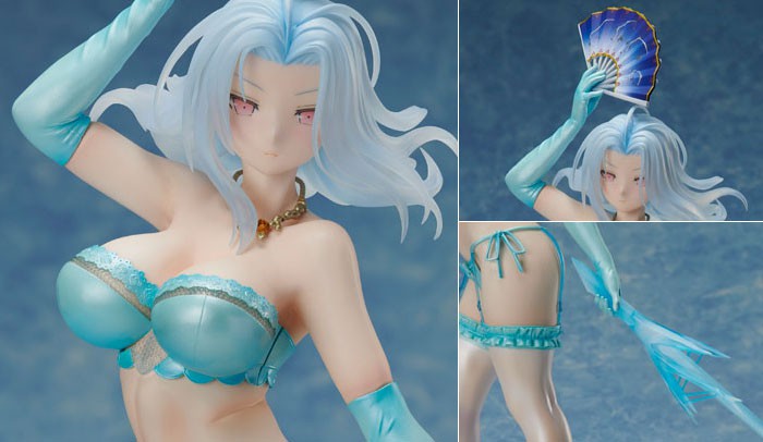 思い切って可愛いを投げ捨てて、綺麗な大人の女性にイメージチェンジした姿を初の立体化。 Gカップグラマラスボディをアイスブルーカラーのセクシーランジェリーに身を包み、左手に氷剣、右手には扇子を持った戦闘モードを魅せる姿を思う存分お楽しみいただけます。